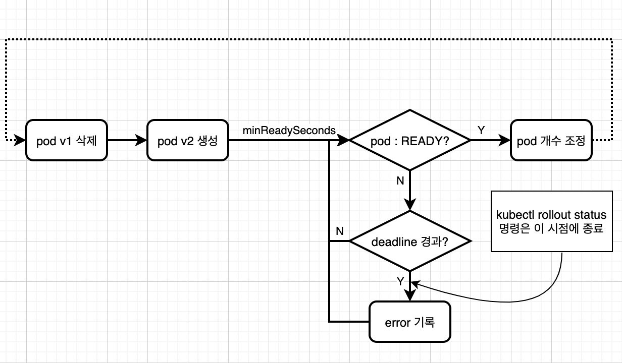 - minReadySeconds 경과 후 pod가 UNREADY > READY 상태로 변경된다면 다음 단계로 넘어간다.