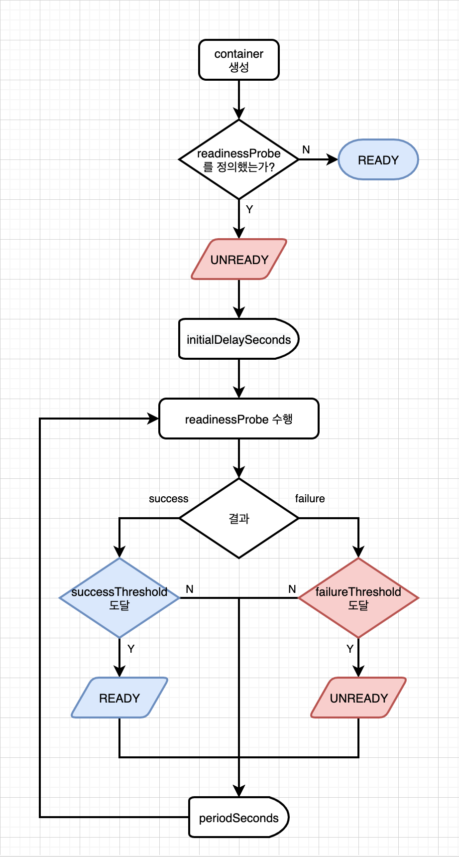 - 만약 container가 UNREADY 상태라면 해당 횟수만큼 readinessProbe를 성공해야 READY 상태가 된다.